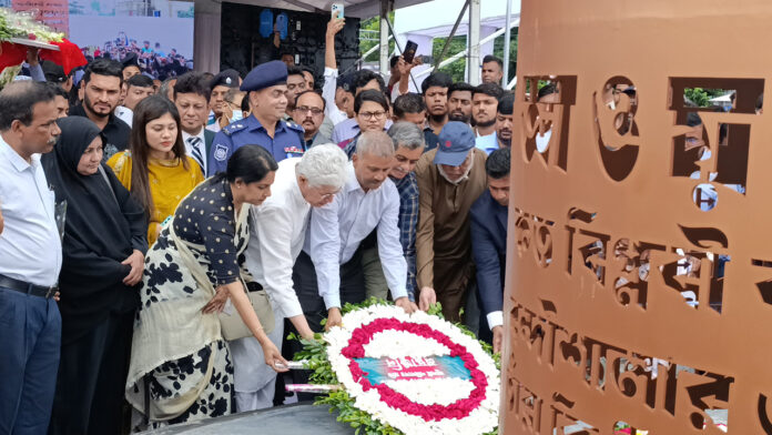 নারায়ণগঞ্জে ২১ জন শহীদের নামে নির্মিত হলো প্রথম ‘জুলাই শহীদ স্মৃতিস্তম্ভ’। সোমবার (১৪ জুলাই) দুপুরে নারায়ণগঞ্জের হাজীগঞ্জ এলাকায় স্মৃতিস্তম্ভটি উদ্বোধন করেন অন্তর্বর্তী সরকারের চার উপদেষ্টা।